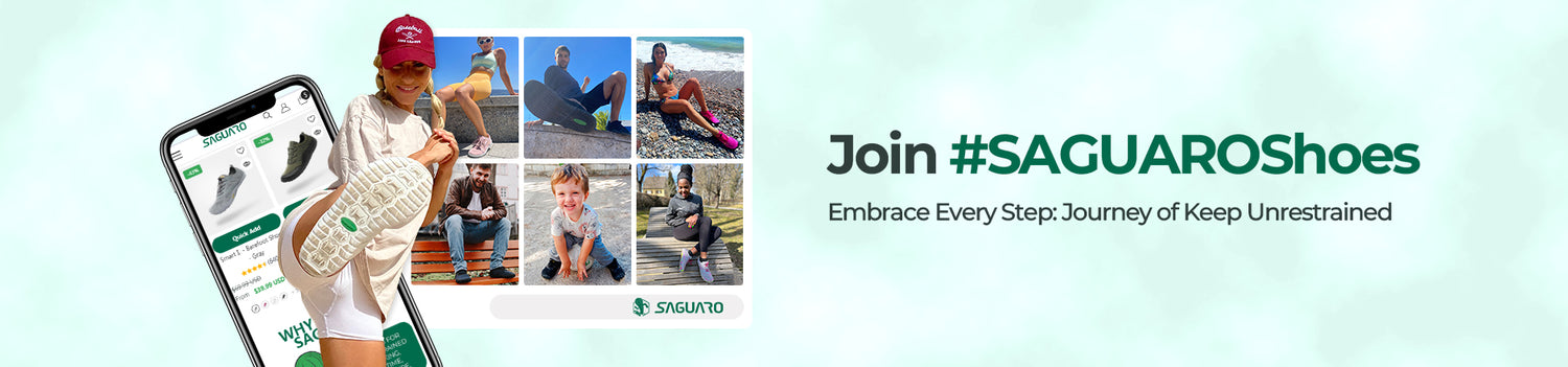 - Publique o conteúdo e mencione a conta oficial da SAGUARO nas redes sociais e use as hashtags #SaguaroShoes e #SaguaroBarefootShoes.